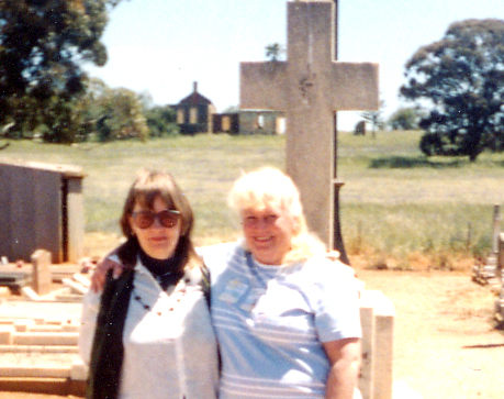 Astrid with Tina at St. John's Cemetery, Kapunda. In the background the large cross denotes the gravesite of the priest rumoured to haunt the cemetery and Reformatory (the ruins in the far background). A visit to the cemetery at night confirmed that the rumours of the haunting are true!