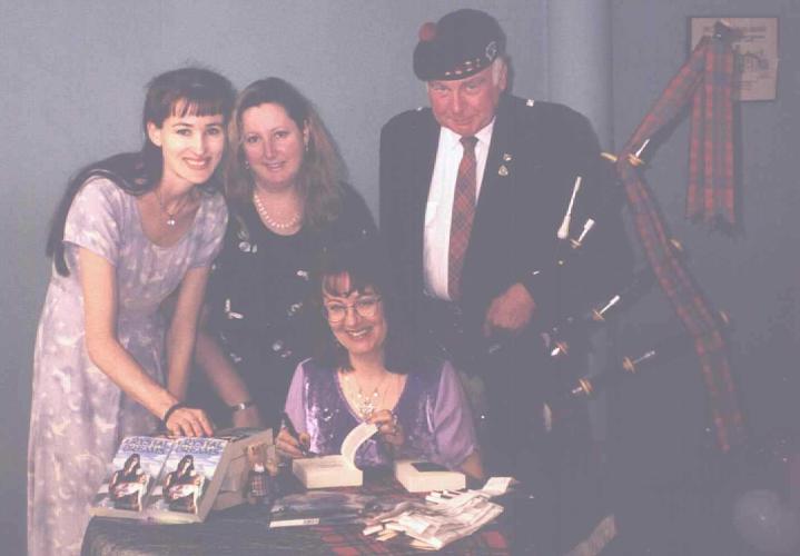 Astrid (seated) with guests at the launch of 'Crystal Dreams'. Des Ross, the Piper, entertained all with many haunting tunes on the bag pipes.