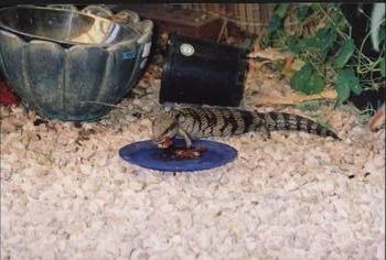 Astrid's menagerie -- feeding time. This is an Aussie blue tongue lizard having its daily meal. When it is hot, the lizards will come into my verandah and lie outside the front door -- getting the cool air blowing on them from the air conditioner!