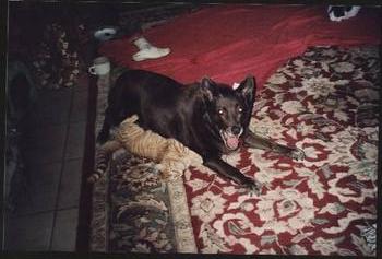 Napper playing with a new kitten -- Edwina. Napper is a Keplie/Aussie cattle dog cross, retired from a farm and Edsi was one of two kittens found the day before my birthday two years ago.